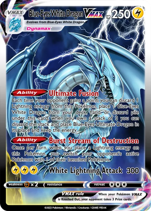 Each time your opponent gains a point, you can discard 1 Lightning energy from this Pokémon, place 1 Blue-Eyes White Dragon from your deck, hand, or discard pile under this card, when you own a stack of 3 you can discard the stack and place Blue-Eyes Ultimate Dragon in its place and keep the energy.Ability: Burst Stream of Destruction