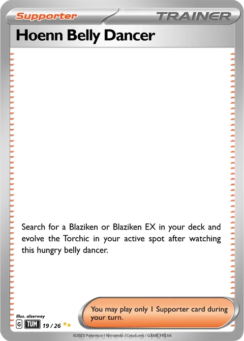 Search for a Blaziken or Blaziken EX in your deck and evolve the Torchic in your active spot after watching this hungry belly dancer.