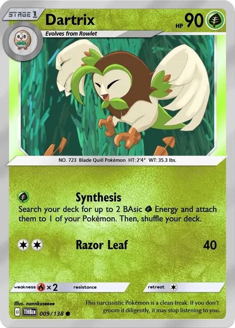 NO. 723 Blade Quill Pokémon HT: 2'4" WT: 35.3 lbs.illus. nannkuseeee#009/138This narcissistic Pokémon is a clean freak. If you don’t groom it diligently, it may stop listening to you.Created by @amyrot on 12 March 2026Includes assets by Creatures Inc.