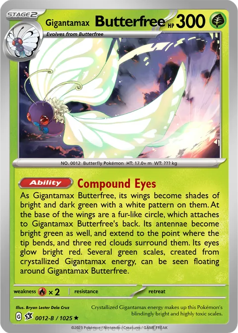 As Gigantamax Butterfree, its wings become shades of bright and dark green with a white pattern on them. At the base of the wings are a fur-like circle, which attaches to Gigantamax Butterfree's back. Its antennae become bright green as well, and extend to the point where the tip bends, and three red clouds surround them. Its eyes glow bright red. Several green scales, created from crystallized Gigantamax energy, can be seen floating around Gigantamax Butterfree.