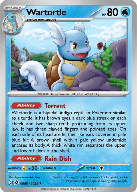 Wartortle is a bipedal, indigo reptilian Pokémon similar to a turtle. It has brown eyes, a dark blue streak on each cheek, and two sharp teeth protruding from its upper jaw. It has three clawed fingers and pointed toes. On each side of its head are feather-like ears covered in pale blue fur. A brown shell with a pale yellow underside encases its body. A thick, white rim separates the upper and lower halves of the shell. Ability: Rain Dish