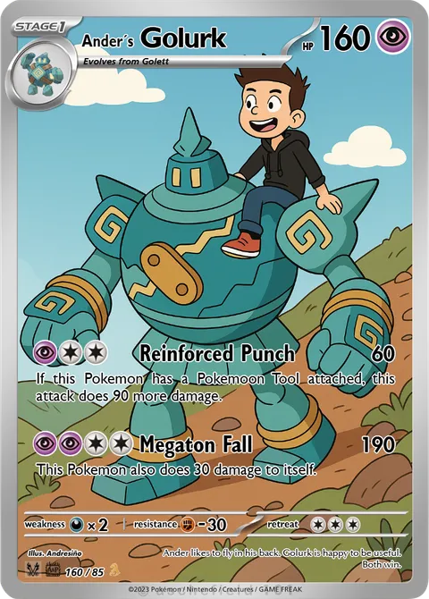 Ander likes to fly in his back. Golurk is happy to be useful. Both win.