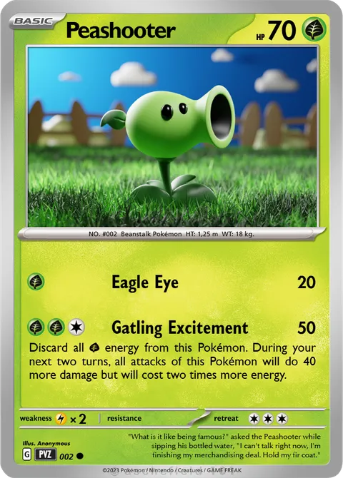 NO. #002 Beanstalk Pokémon HT: 1,25 m WT: 18 kg.illus. Anonymous#002"What is it like being famous?" asked the Peashooter while sipping his bottled water, "I can't talk right now, I'm finishing my merchandising deal. Hold my fir coat."Created by @anilwashere on 01 July 2025