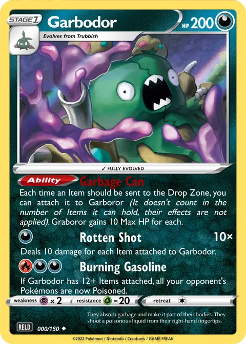 Each time an Item should be sent to the Drop Zone, you can attach it to Garboror (It doesn't count in the number of Items it can hold, their effects are not applied). Graboror gains 10 Max HP for each.Rotten Shot • 10×
