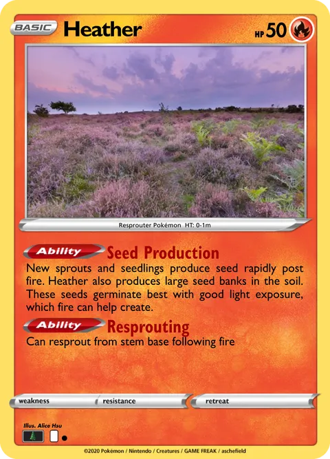 New sprouts and seedlings produce seed rapidly post fire. Heather also produces large seed banks in the soil. These seeds germinate best with good light exposure, which fire can help create.Ability: Resprouting
