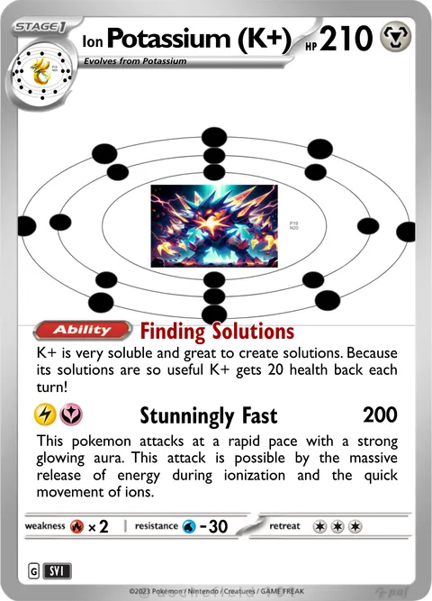 K+ is very soluble and great to create solutions. Because its solutions are so useful K+ gets 20 health back each turn!Stunningly Fast • 200