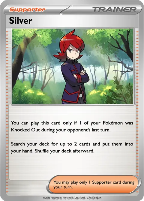 You can play this card only if 1 of your Pokémon was Knocked Out during your opponent’s last turn. Search your deck for up to 2 cards and put them into your hand. Shuffle your deck afterward.