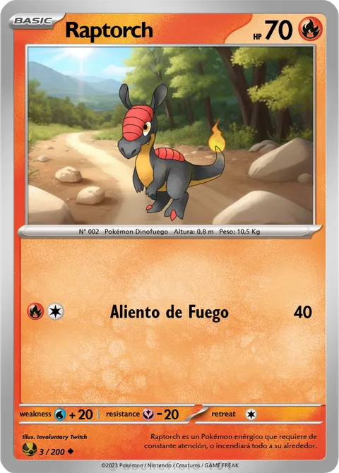 Raptorch es un Pokémon enérgico que requiere de constante atención, o incendiará todo a su alrededor.