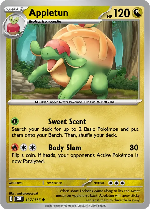 NO. 0842 Apple Nectar Pokémon HT: 1'4" WT: 28.7 lbs.illus. makotonoaraki#137/175When some Lechonk come along to lick the sweet nectar on Appletun's back, Appletun will spew sticky nectar at them to drive them away.Created by @beens47 on 24 November 2025.