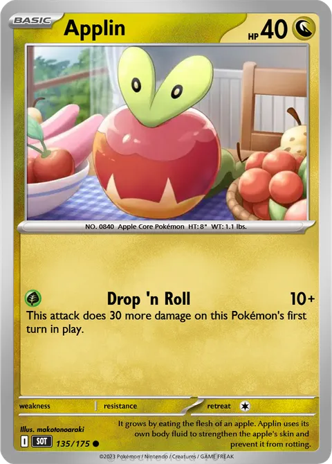 NO. 0840 Apple Core Pokémon HT: 8" WT: 1.1 lbs.illus. makotonoaraki#135/175It grows by eating the flesh of an apple. Applin uses its own body fluid to strengthen the apple's skin and prevent it from rotting.Created by @beens47 on 24 November 2025.