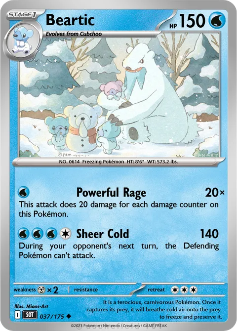 NO. 0614 Freezing Pokémon HT: 8'6" WT: 573.2 lbs.illus. Mions-Art#037/175It is a ferocious, carnivorous Pokémon. Once it captures its prey, it will breathe cold air onto the prey to freeze and preserve it.Created by @beens47 on 30 October 2025.