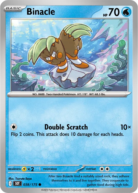 NO. 0688 Two-Handed Pokémon HT: 1'8" WT: 68.3 lbs.illus. Tsuruta Saya#038/175After two Binacle find a suitably sized rock, they adhere themselves to it and live together. They cooperate to gather food during high tide.Created by @beens47 on 30 October 2025.