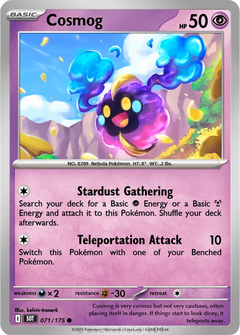 NO. 0789 Nebula Pokémon HT: 8" WT: .2 lbs.illus. kelvin-tranerk#071/175Cosmog is very curious but not very cautious, often placing itself in danger. If things start to look dicey, it teleports away.Created by @beens47 on 17 November 2025.