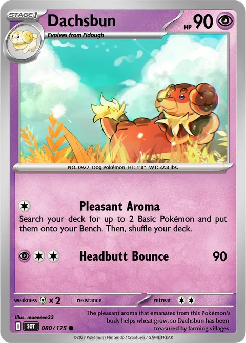 NO. 0927 Dog Pokémon HT: 1'8" WT: 32.8 lbs.illus. moeeeee33#080/175The pleasant aroma that emanates from this Pokémon's body helps wheat grow, so Dachsbun has been treasured by farming villages.Created by @beens47 on 19 November 2025.