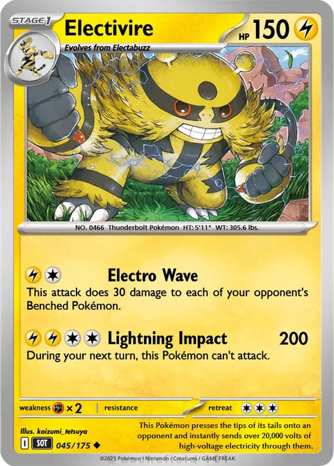 NO. 0466 Thunderbolt Pokémon HT: 5'11" WT: 305.6 lbs.illus. koizumi_tetsuya#045/175This Pokémon presses the tips of its tails onto an opponent and instantly sends over 20,000 volts of high-voltage electricity through them.Created by @beens47 on 06 November 2025.