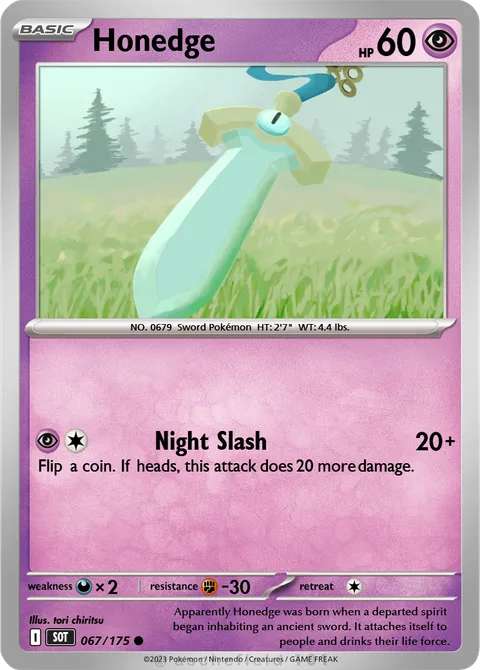 NO. 0679 Sword Pokémon HT: 2'7" WT: 4.4 lbs.illus. tori chiritsu#067/175Apparently Honedge was born when a departed spirit began inhabiting an ancient sword. It attaches itself to people and drinks their life force.Created by @beens47 on 17 November 2025.