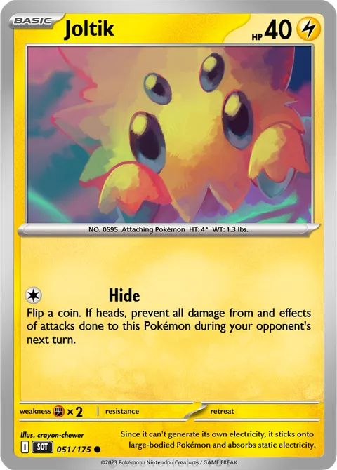 NO. 0595 Attaching Pokémon HT: 4" WT: 1.3 lbs.illus. crayon-chewer#051/175Since it can't generate its own electricity, it sticks onto large-bodied Pokémon and absorbs static electricity.Created by @beens47 on 11 November 2025.