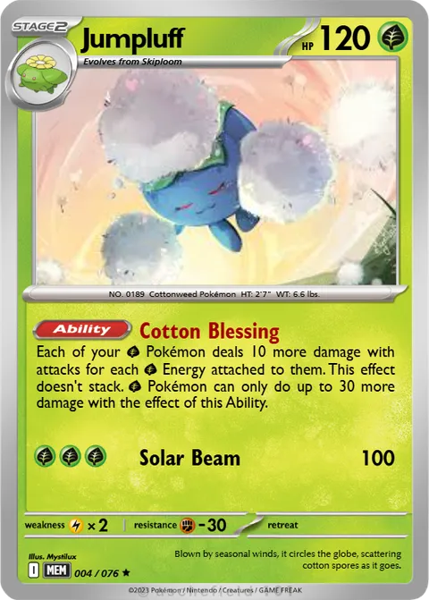 Each of your G Pokémon deals 10 more damage with attacks for each G Energy attached to them. This effect doesn't stack. G Pokémon can only do up to 30 more damage with the effect of this Ability.Solar Beam • 100
