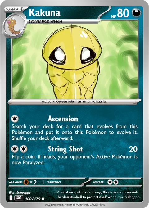 NO. 0014 Cocoon Pokémon HT: 2' WT: 22 lbs.illus. Erinpuppy#100/175Almost incapable of moving, this Pokémon can only harden its shell to protect itself when it is in danger.Created by @beens47 on 21 November 2025.