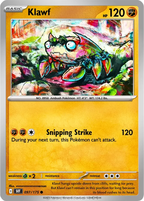 NO. 0950 Ambush Pokémon HT: 4'3" WT: 174.2 lbs.illus. vvvvvvvvvvvvvvvernon#097/175Klawf hangs upside-down from cliffs, waiting for prey. But Klawf can't remain in this position for long because its blood rushes to its head.Created by @beens47 on 21 November 2025.