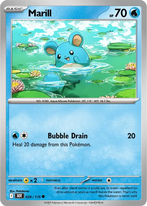 NO. 0183 Aqua Mouse Pokémon HT: 1'4" WT: 18.7 lbs.illus. PinkGermy#029/175Even after Marill swims in a cold sea, its water- repellent fur dries almost as soon as Marill leaves the water. That’s why this Pokémon is never cold.Created by @beens47 on 15 October 2025.