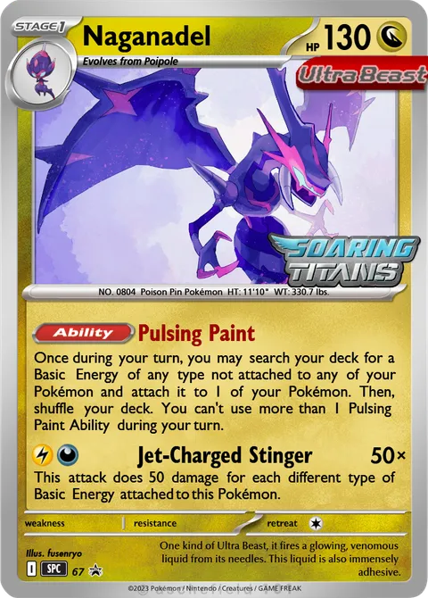 Once during your turn, you may search your deck for a Basic Energy of any type not attached to any of your Pokémon and attach it to 1 of your Pokémon. Then, shuffle your deck. You can't use more than 1 Pulsing Paint Ability during your turn.Jet-Charged Stinger • 50×