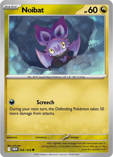 NO. 0714 Sound Wave Pokémon HT: 1'8" WT: 17.6 lbs.illus. null-suke#058/076After nightfall, they emerge from the caves they nest in during the day. Using their ultrasonic waves, they go on the hunt for ripened fruit.Created by @beens47 on 09 September 2025.