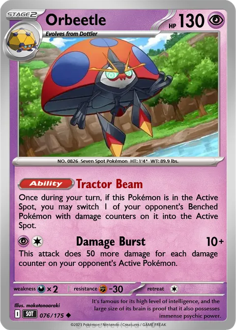 Once during your turn, if this Pokémon is in the Active Spot, you may switch 1 of your opponent's Benched Pokémon with damage counters on it into the Active Spot.Damage Burst • 10+