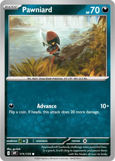 NO. 0624 Sharp Blade Pokémon HT: 1'8" WT: 22.5 lbs.illus. go-lurk#111/175Pawniard will fearlessly challenge even powerful foes. In a pinch, it will cling to opponents and pierce them with the blades all over its body.Created by @beens47 on 21 November 2025.
