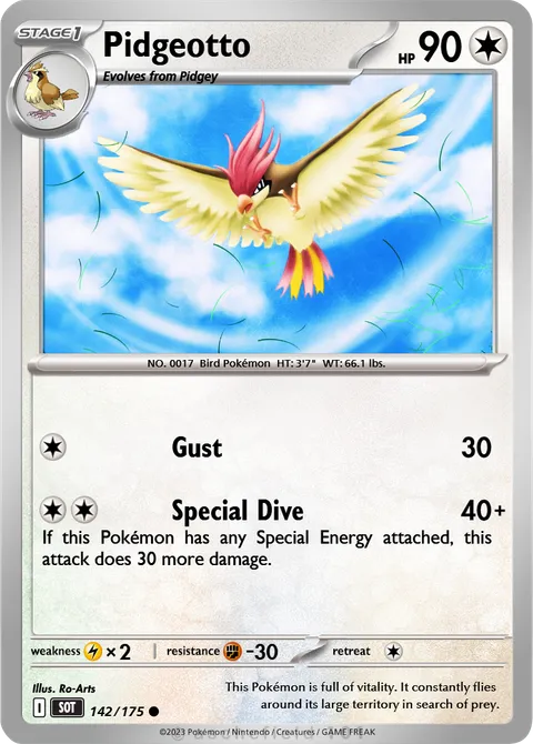 NO. 0017 Bird Pokémon HT: 3'7" WT: 66.1 lbs.illus. Ro-Arts#142/175This Pokémon is full of vitality. It constantly flies around its large territory in search of prey.Created by @beens47 on 25 November 2025.