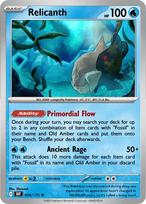 Once during your turn, you may search your deck for up to 2 in any combination of Item cards with "Fossil" in their name and Old Amber cards and put them onto your Bench. Shuffle your deck afterwards.Ancient Rage • 50+