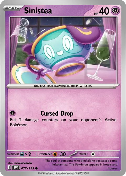 NO. 0854 Black Tea Pokémon HT: 4" WT: .4 lbs.illus. makotonoaraki#077/175The soul of someone who died alone possessed some leftover tea. This Pokémon appears in hotels and houses.Created by @beens47 on 19 November 2025.