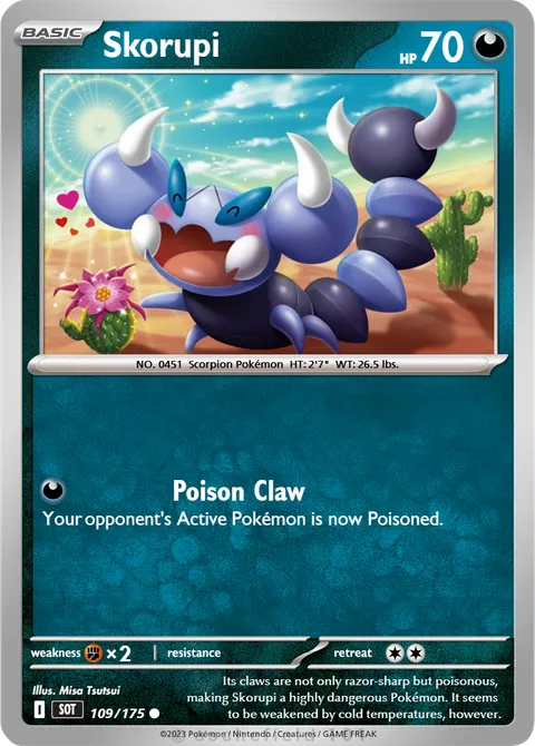 NO. 0451 Scorpion Pokémon HT: 2'7" WT: 26.5 lbs.illus. Misa Tsutsui#109/175Its claws are not only razor-sharp but poisonous, making Skorupi a highly dangerous Pokémon. It seems to be weakened by cold temperatures, however.Created by @beens47 on 21 November 2025.