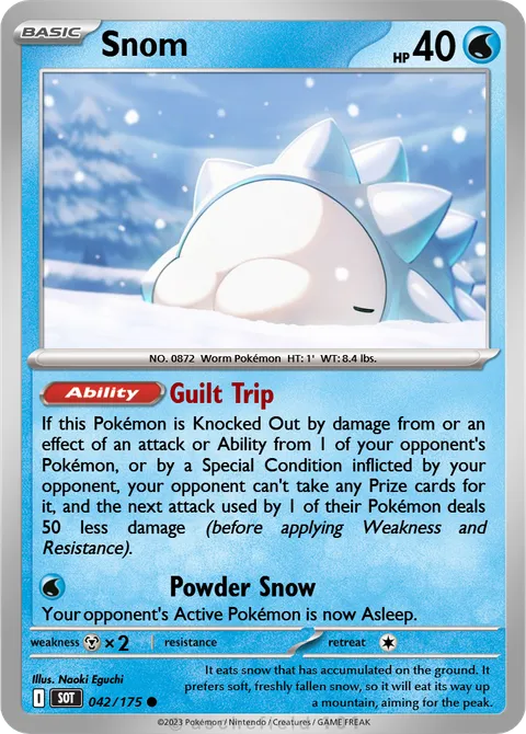 If this Pokémon is Knocked Out by damage from or an effect of an attack or Ability from 1 of your opponent's Pokémon, or by a Special Condition inflicted by your opponent, your opponent can't take any Prize cards for it, and the next attack used by 1 of their Pokémon deals 50 less damage (before applying Weakness and Resistance).Powder Snow