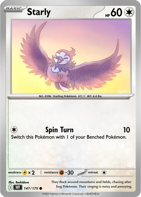 NO. 0396 Starling Pokémon HT: 1' WT: 4.4 lbs.illus. Reshidove#147/175They flock around mountains and fields, chasing after bug Pokémon. Their singing is noisy and annoying.Created by @beens47 on 27 November 2025.