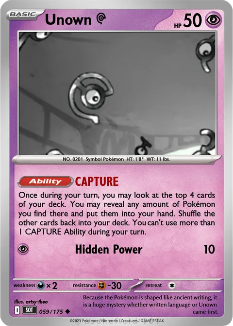 Once during your turn, you may look at the top 4 cards of your deck. You may reveal any amount of Pokémon you find there and put them into your hand. Shuffle the other cards back into your deck. You can't use more than 1 CAPTURE Ability during your turn.Hidden Power • 10