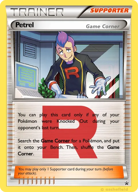 You can play this card only if any of your Pokémon were Knocked Out during your opponent's last turn. Search the Game Corner for a Pokémon, and put it onto your Bench. Then, shuffle the Game Corner.