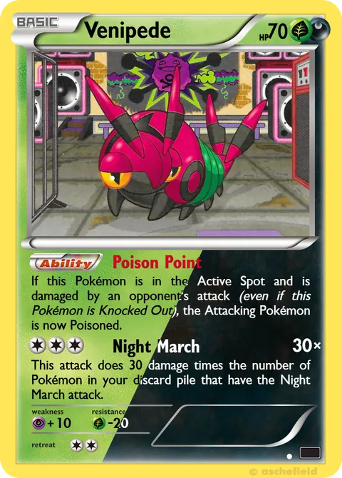 If this Pokémon is in the Active Spot and is damaged by an opponent's attack (even if this Pokémon is Knocked Out), the Attacking Pokémon is now Poisoned.Night March • 30×