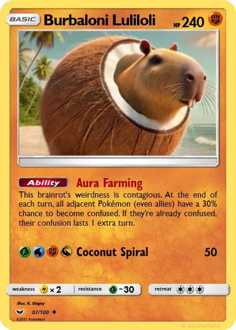 This brainrot's weirdness is contagious. At the end of each turn, all adjacent Pokémon (even allies) have a 30% chance to become confused. If they’re already confused, their confusion lasts 1 extra turn.