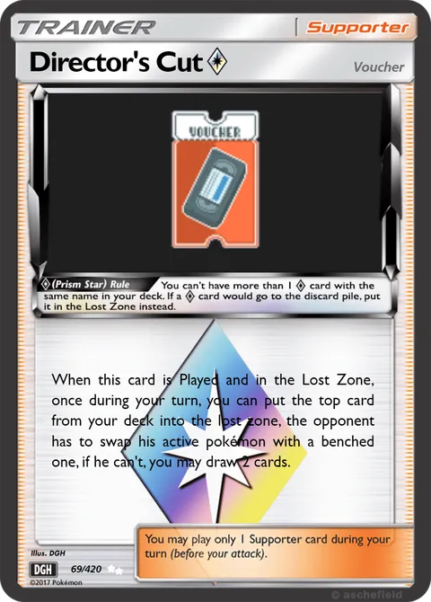 When this card is Played and in the Lost Zone, once during your turn, you can put the top card from your deck into the lost zone, the opponent has to swap his active pokémon with a benched one, if he can't, you may draw 2 cards.