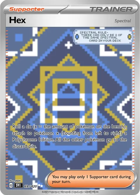 Roll a dx (x = the amount of pokémon on the bench), attach to pokémon x (counting from left to right) a Polychrome Edition. All the other pokémon go to the discard pile.