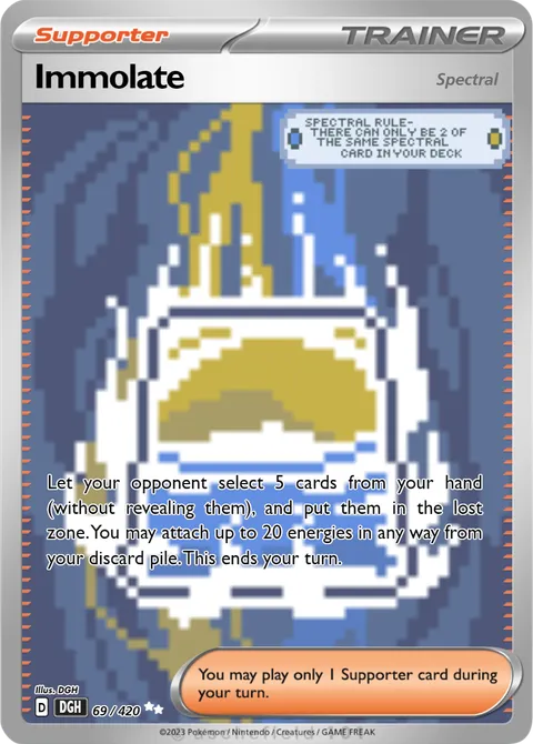 Let your opponent select 5 cards from your hand (without revealing them), and put them in the lost zone. You may attach up to 20 energies in any way from your discard pile. This ends your turn.