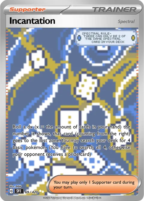 Roll a dx (x = the amount of cards in your hand) the number it shows, that card (counting from the right) goes to the lost zone. You may search your deck for 4 basic pokémon. (You have to search all 4, otherwise your opponent receives a prize card)