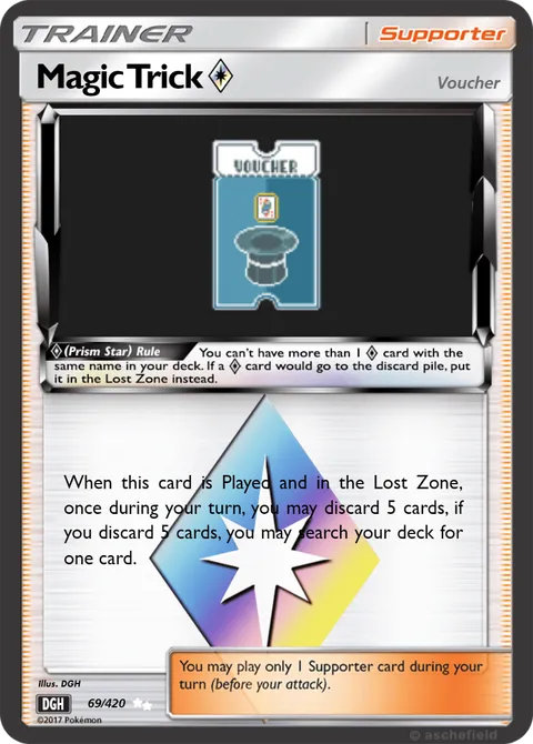 When this card is Played and in the Lost Zone, once during your turn, you may discard 5 cards, if you discard 5 cards, you may search your deck for one card.