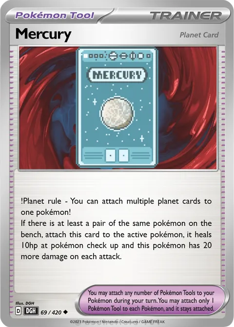 !Planet rule - You can attach multiple planet cards to one pokémon! If there is at least a pair of the same pokémon on the bench, attach this card to the active pokémon, it heals 10hp at pokémon check up and this pokémon has 20 more damage on each attack.