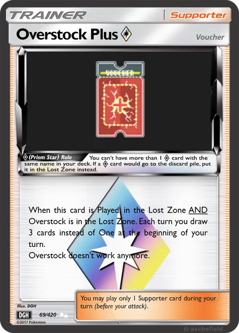 When this card is Played, in the Lost Zone AND Overstock is in the Lost Zone. Each turn you draw 3 cards instead of One at the beginning of your turn. Overstock doesn't work anymore.