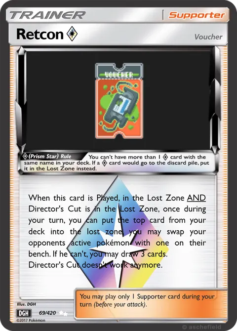 When this card is Played, in the Lost Zone AND Director's Cut is in the Lost Zone, once during your turn, you can put the top card from your deck into the lost zone, you may swap your opponents active pokémon with one on their bench. If he can't, you may draw 3 cards. Director's Cut doesn't work anymore.