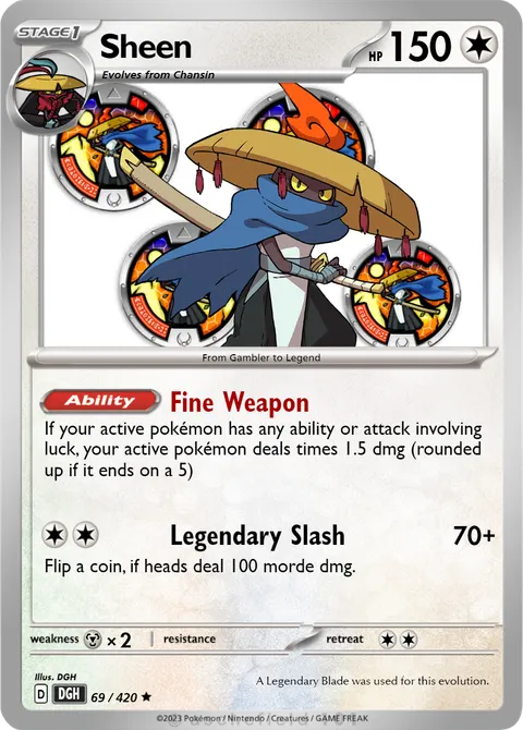If your active pokémon has any ability or attack involving luck, your active pokémon deals times 1.5 dmg (rounded up if it ends on a 5)Legendary Slash • 70+