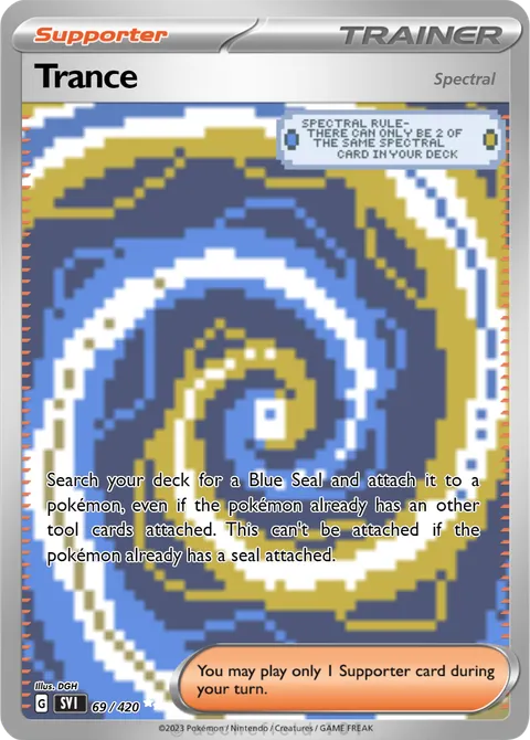Search your deck for a Blue Seal and attach it to a pokémon, even if the pokémon already has an other tool cards attached. This can't be attached if the pokémon already has a seal attached.