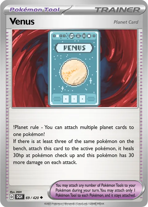 !Planet rule - You can attach multiple planet cards to one pokémon! If there is at least three of the same pokémon on the bench, attach this card to the active pokémon, it heals 30hp at pokémon check up and this pokémon has 30 more damage on each attack.